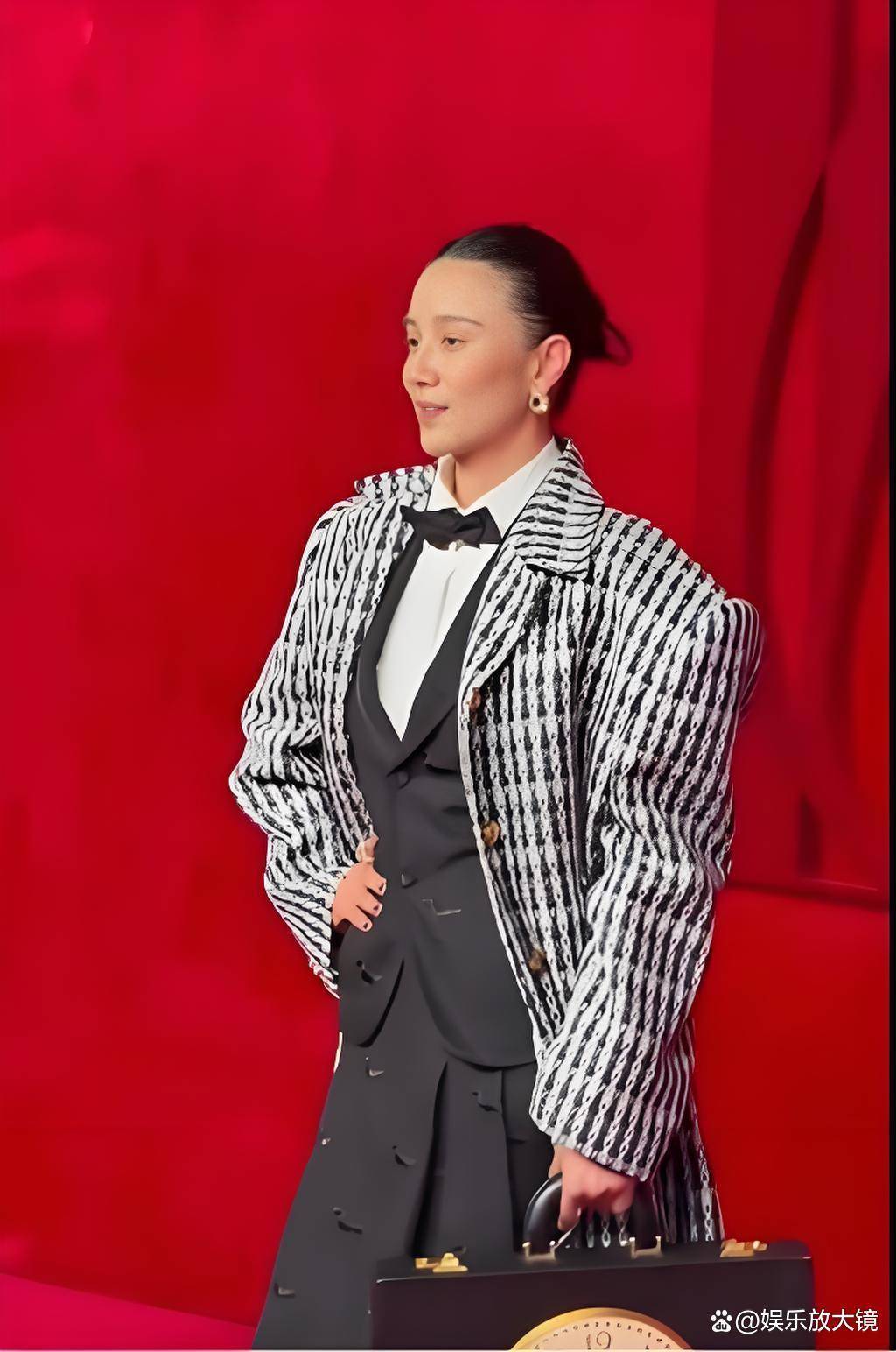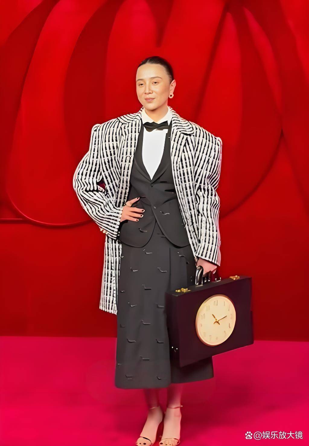 在众多争议造型中,也有女星凭借稳妥选择脱颖而出。黑色衬衫搭配百褶裙,简约大方的设计避开了复杂元素的雷区,干净的妆容与利落的发型相得益彰,即便被指出小腹问题,但整体的优雅气质依旧在线,成为当晚难得的清流。